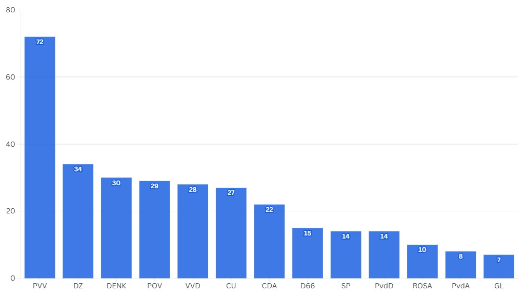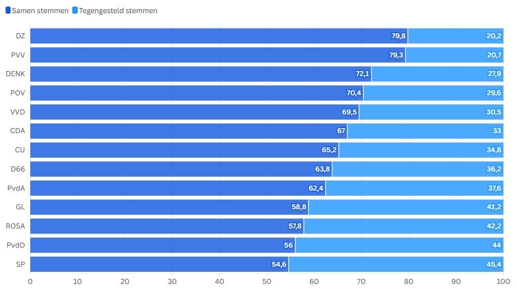 De linkse partijen zijn het minst vaak in overeenstemming met LZ. De SP staat onderaan, de partijen stemmen ongeveer de helft tegengesteld.