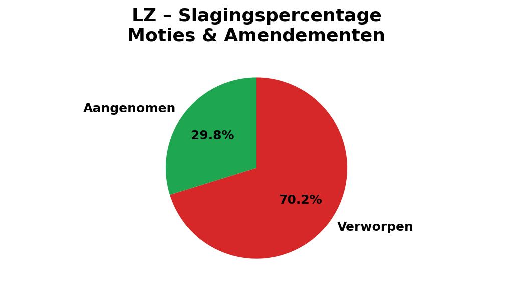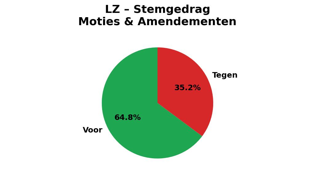 Voor amendementen en moties van andere partijen was de partij een stuk liever. LZ stemde tegen slechts 35,2 procent van de moties en amendementen en voor 64,8 procent. De voorstellen die LZ zelf (mee)indiende, zitten daar ook bij.