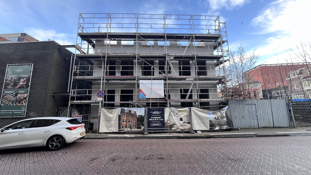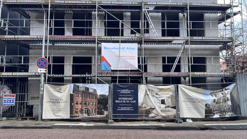 Wat ze kosten staat niet op het spandoek, alleen dat ze ‘luxeus’ zijn. En duurzaam. Bij Maas Developments (‘Sustainable hotel locations in Europe where heritage and innovation converge) is alleen te vinden dat de ‘DAM Appartments’ in 2026 opgeleverd worden.