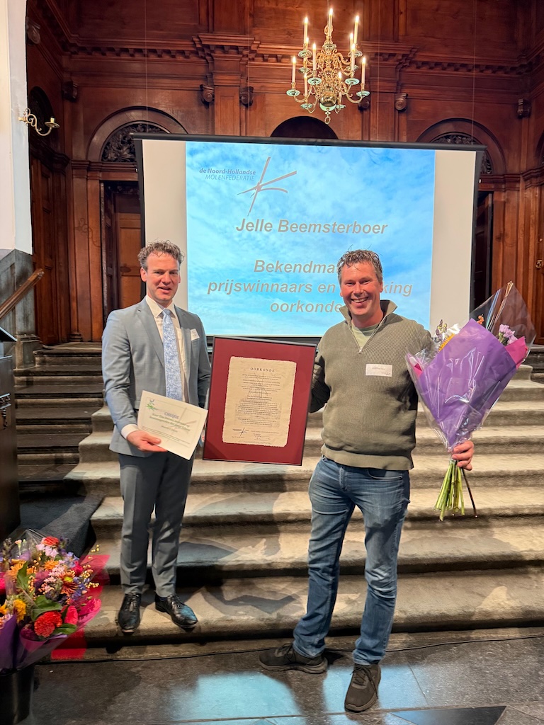 Door Piet Bakker & Merel Kan met foto’s en informatie van Gerrit Admiraal en van de website van de Noord-Hollandse Molenfederatie. Op de foto boven Tim Doeves in het midden met links naast hem gedeputeerde Jelle Beemsterboer. Voorzitter van de Noord-Hollandse Molenfederatie is Peter Tange (rechts).