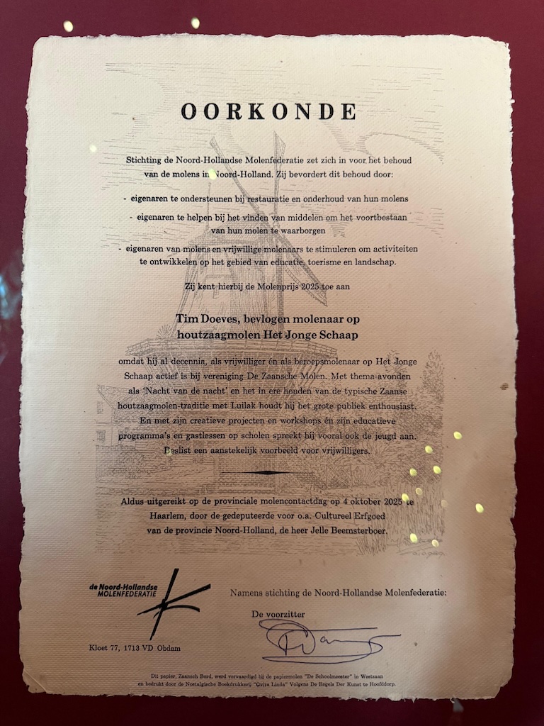 Tim Doeves, ‘bevlogen’ molenaar van houtzaagmolen Het Jonge Schaap, heeft de molenprijs 2025 van de Noord-Hollandse Molenfederatie gewonnen. De prijs – met bijbehorende oorkonde – werd door gedeputeerde Jelle Beemsterboer uitgereikt in het gemeentehuis van Haarlem.