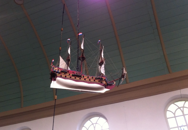 Vandaag en morgen Open Monumentendag. Boven foto’s van de Zaan-kant van pakhuis De Wildeboer (Wormerveer, Dubbele Buurt), het interieur van de Hervormde Kerk in Krommenie en het scheepsmodel in de kerk in Krommeniedijk.