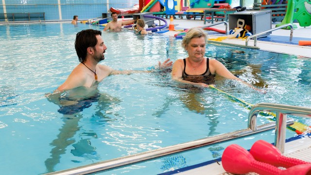 Het warme water van een therapiebad ontspant spieren. ‘Voor mensen die laag belastbaar zijn, wordt bewegen veel makkelijker. Zo kunnen zij toch spierkracht opbouwen.’