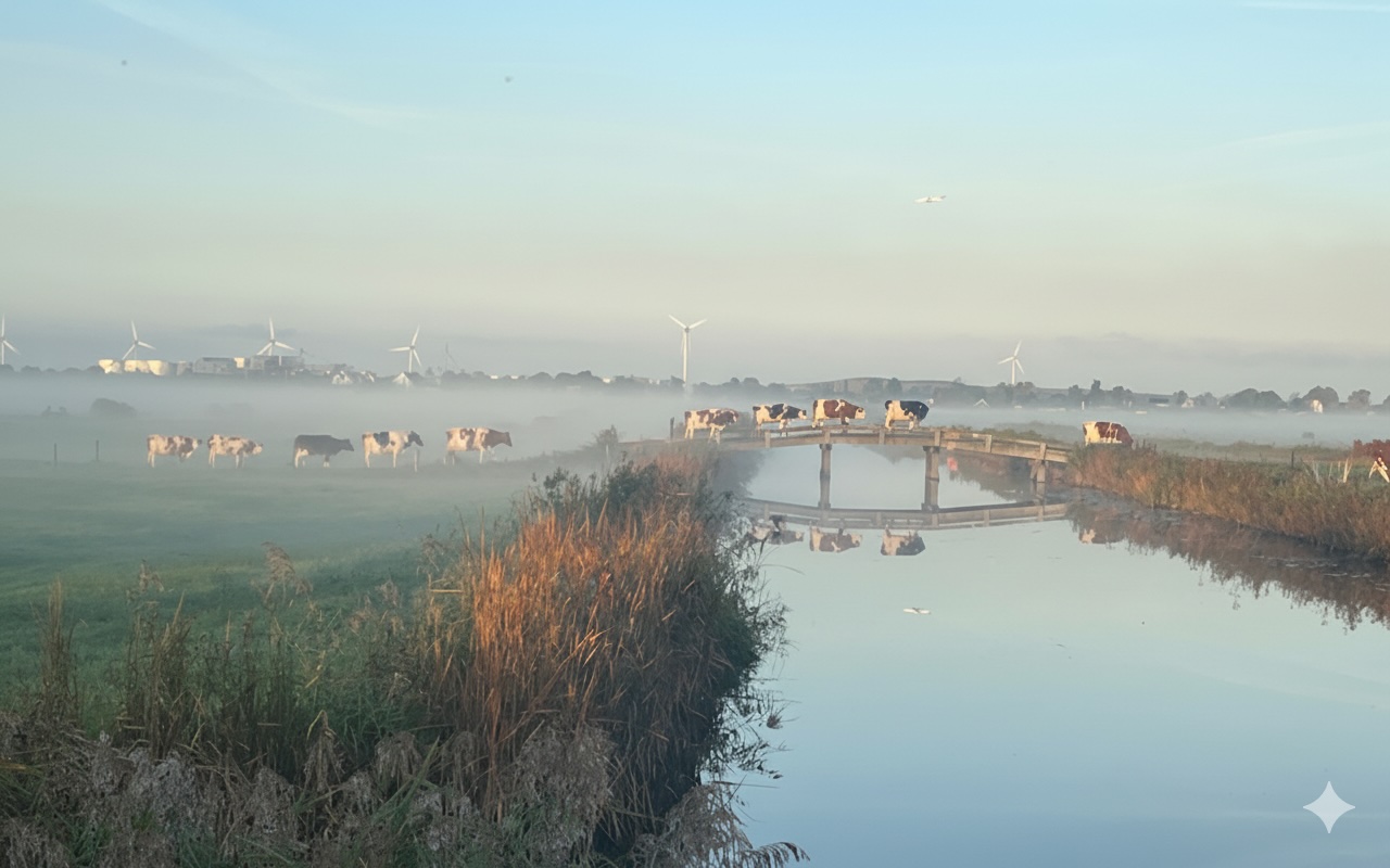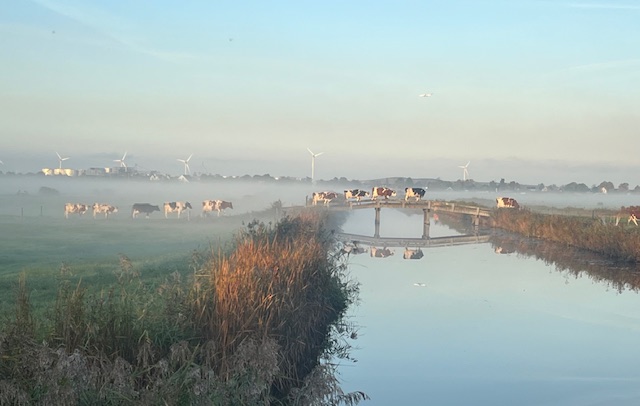 Kan het Hollandser? Koeien in het weiland. Molens – moderne windturbines in dit geval – op de achtergrond. En een schilderachtig weerspiegeling in de sloot.