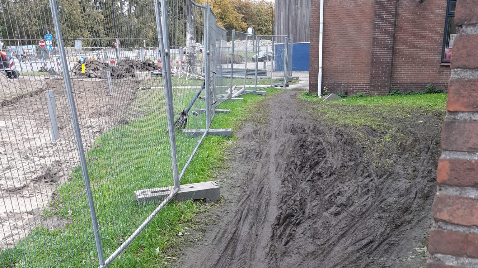 Omdat deze route voor voetgangers vaak niet te doen is, omdat de stoep vaak vol met auto’s en vrachtwagens staat en er anders over de autoweg gewandeld moet worden, is er een informeel ‘olifantspaadje’ ontstaan. Door de regen is dit een modderpoel geworden waar ook fietsers gebruik van maken.