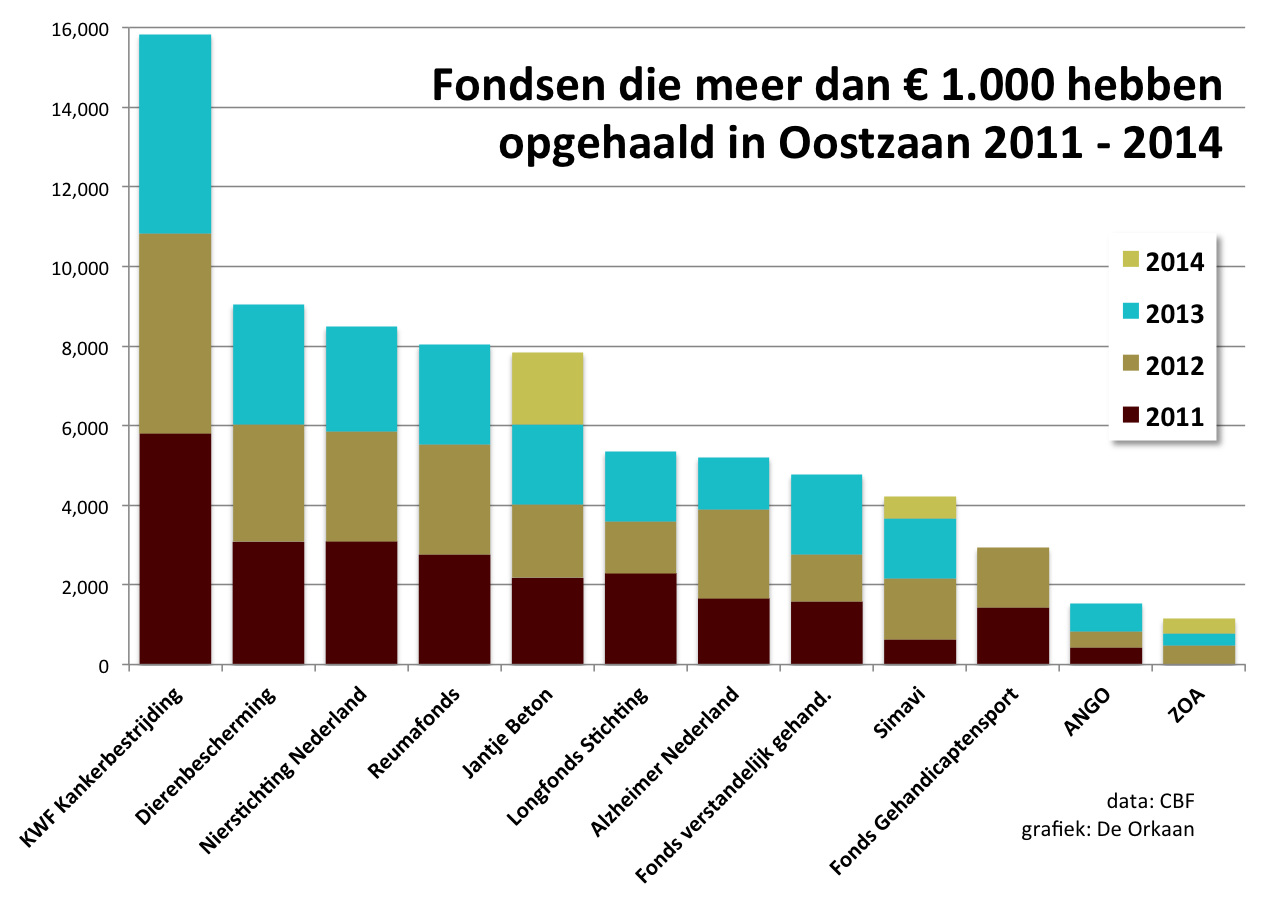 Kankerbestrijding, nieren en dieren krijgen het meeste; 12 fondsen halen €1000 of meer op. KWF tussen de €5000 en €6000 per jaar.
