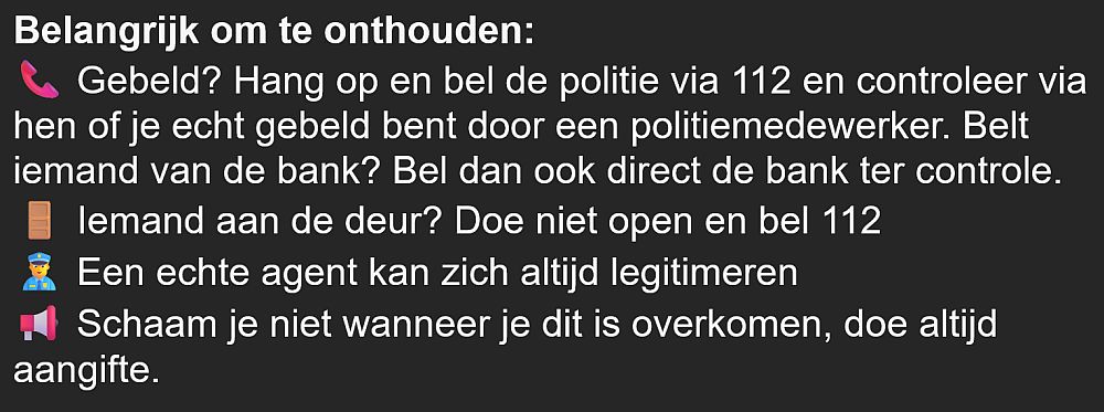 De politie ziet de laatste tijd een toename van oplichting door bijvoorbeeld nepagenten of zogenaamde medewerkers van banken. Ze vertellen dan dat ze langskomen om spullen ‘veilig te stellen’ vanwege inbraken. De politie laat weten dat agenten dat nooit zullen doen, en banken zullen ook nooit zomaar bellen. Mocht dat wel het geval zijn, hang dan op en bel met je bank om te controleren of je echt met een bankmedewerker hebt gesproken.
