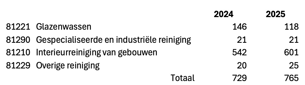 Vooral de categorie Interieurreiniging van gebouwen (SBI-code 81210) is van belang. Daar zaten in 2024 niet minder dan 542 bedrijven in (gespecialiseerde en overige reiniging samen ruim 80). Onder al die codes zaten volgens de KvK in het begin van 2024 in totaal 729 bedrijven die zich bezighielden met schoonmaakwerk (in 2025: 765).