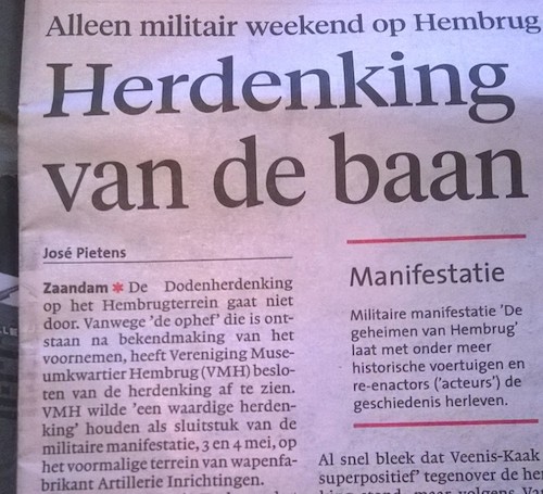 In Dagblad Zaanstreek schrijft José Pietens dat de initiatiefnemers van de dodenherdenking afzien.