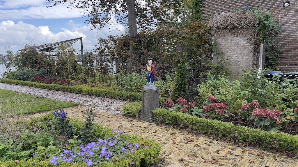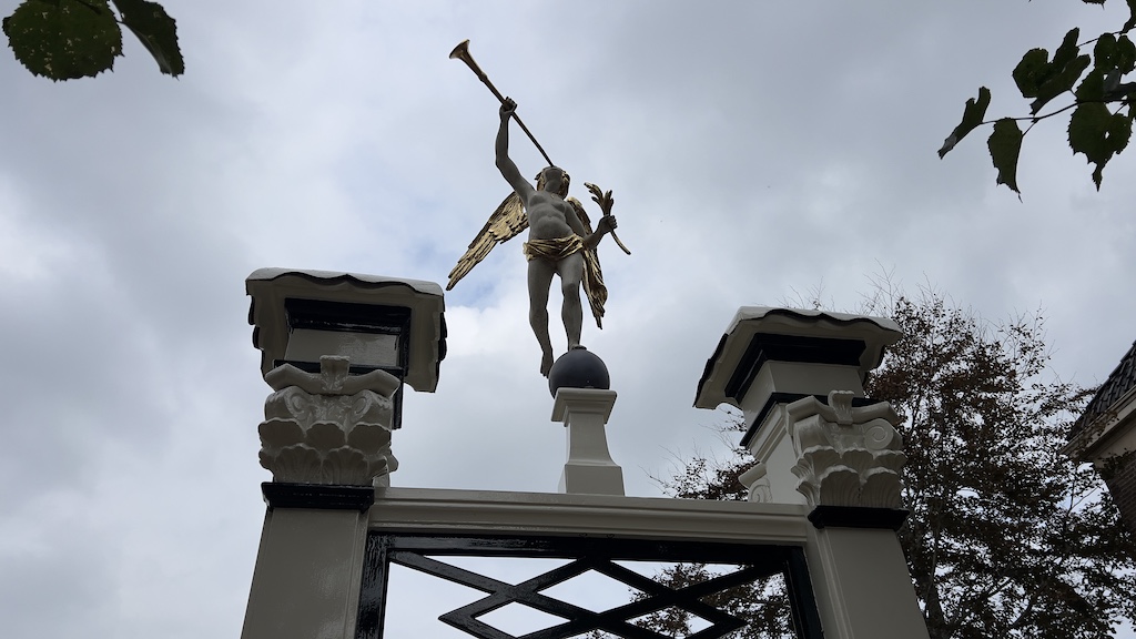 De tuin is afgesloten met een groen-wit hek. Boven de poort prijkt weer het prachtige faambeeld. Ooit geschonken door de directie van Duyvis Oliefabrieken N.V.