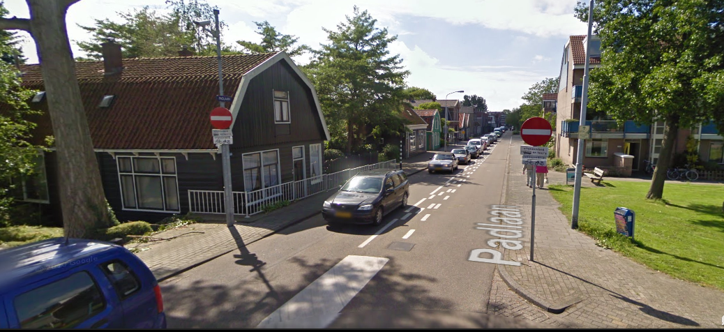 (Foto van Google Streetview dateert van 2009, toen de Padlaan ook al eenrichtingsverkeer was.)