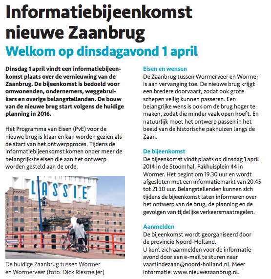 Morgenavond organiseert de Provincie Noord-Holland een informatiebijeenkomst over de nieuwe Zaanbrug.