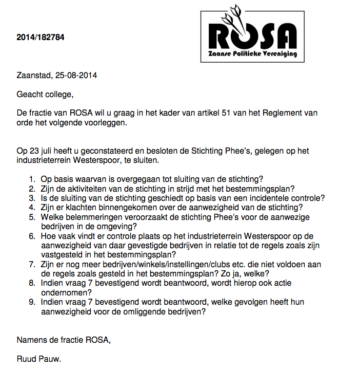 Fractievoorzitter Ruud Pauw (Rosa) is geboeid geraakt door de sluiting van SM-club Phee’s. Kort en bondig vraagt hij het college om opheldering. Eigenlijk slaat het nergens op, die sluting.