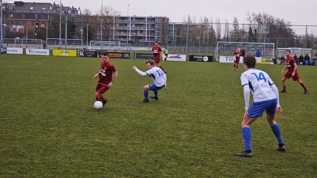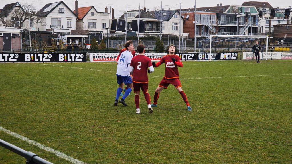 Het was lang wachten op een beetje spektakel. Een toeschouwer had de zin ‘het zal wel 0-0 blijven tot de rust’ nog niet uitgesproken, toen plots het net bolde. Lex Verwoerd werd op links weggestuurd, gaf de bal scherp voor het doel langs en Jesse Huygens was er als de kippen bij: 0-1.