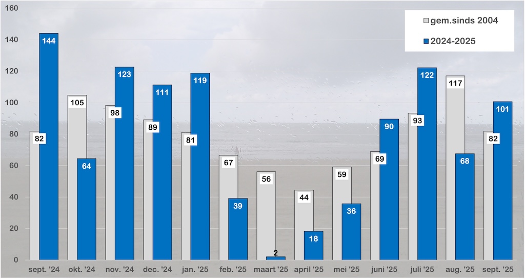 Onder de gemiddelde neerslag – ook vergeleken met het gemiddelde sinds 2004. September 2025 was natter dan gemiddeld.