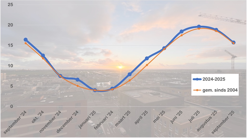 September was een zonnige maand met 193 zonuren. Gemiddeld over het land werden 188 uur zon geregistreerd tegen een langjarig gemiddelde van 159 uur. 2025 verloopt daarmee tot nu toe recordzonnig, met alleen in januari minder zon dan gebruikelijk.