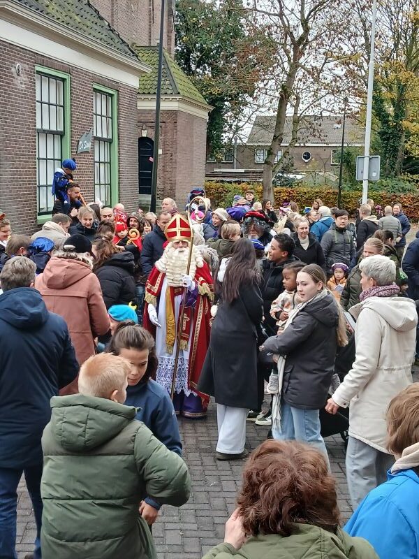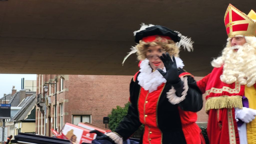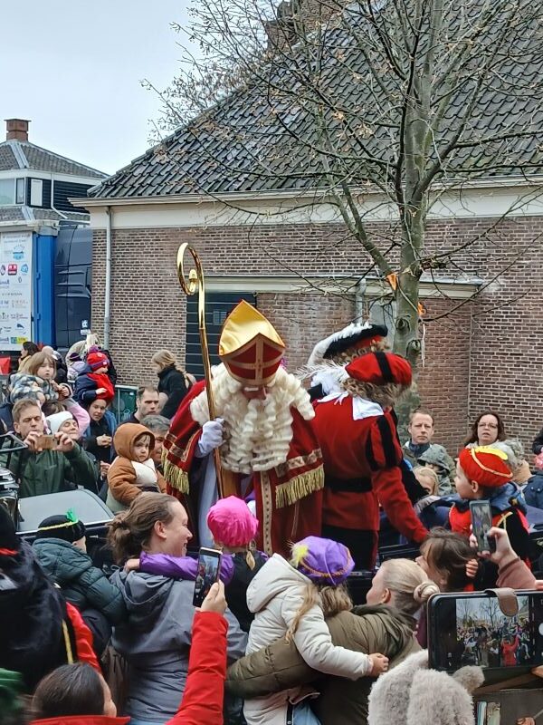 ‘Welkom in Nederland,’ zei de burgemeester, terwijl de Pieten meteen begonnen met het uitdelen van kruidnoten aan alle lieve kinderen langs de kade. Kleine handjes zwaaiden enthousiast naar de Sint, die iedereen vriendelijk begroette.