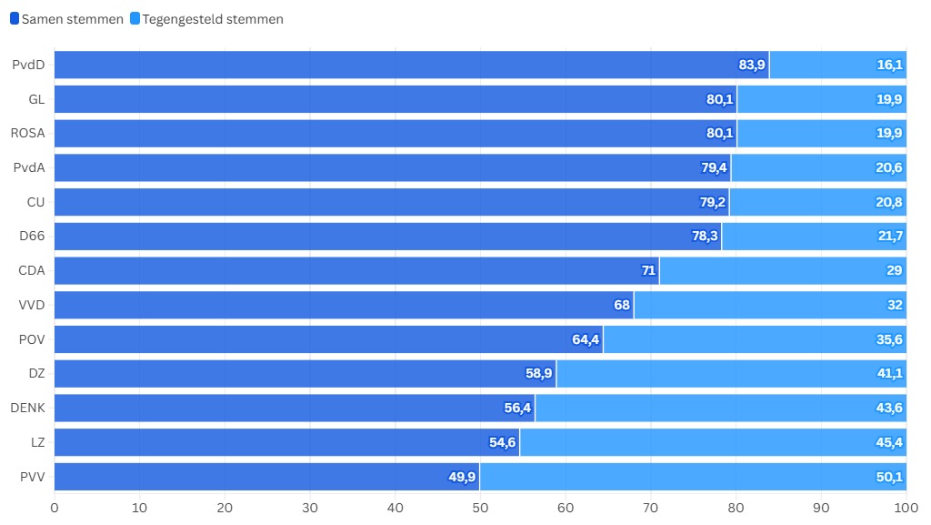 Met de PVV is de SP het minst in overeenstemming. Net iets minder dan de helft van de keren stemmen de socialisten hetzelfde.