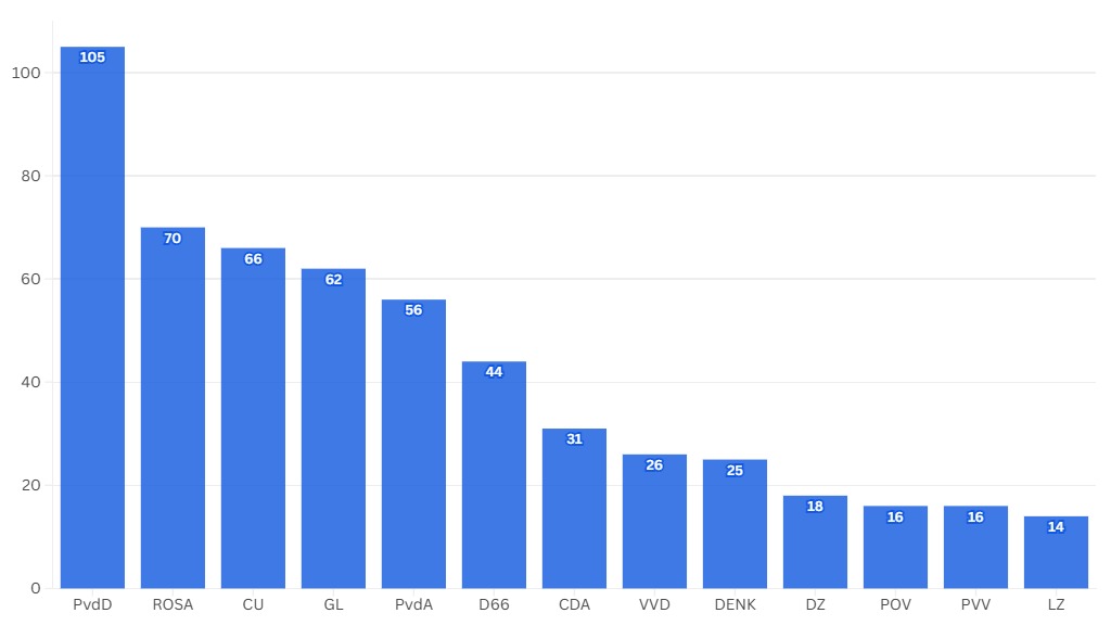 De PvdD diende tijdens de raadsperiode veruit het vaakst moties en amendementen in met de PvdD. De andere linkse partijen: ROSA CU, GL en PvdA werkten allemaal ongeveer evenveel met hen samen. De rechtse partijen vallen in het niet ten opzichte van de linkse vrienden van de SP. LZ staat in deze lijst met acht moties en amendementen het allerlaagst.