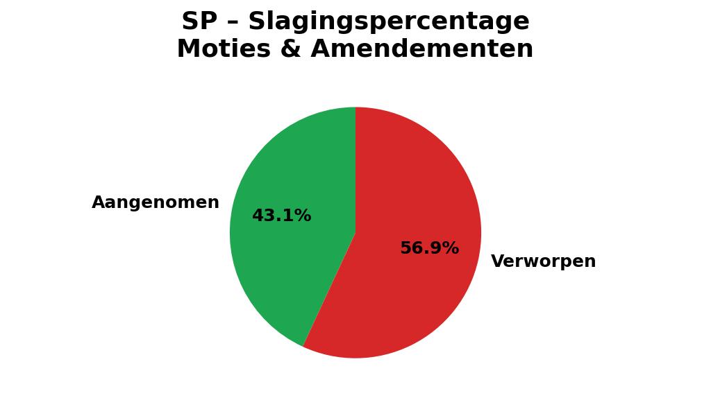 Voor amendementen en moties van andere partijen was de partij een stuk liever. De SP stemde voor 60,9 procent van de moties en amendementen en tegen 39,1 procent. De vele voorstellen die de SP zelf (mee)indiende, zitten daar ook bij.