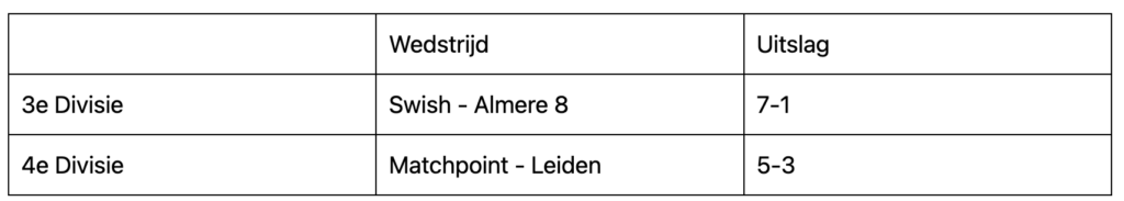 Matchpoint staat bijna onderaan in de 4e Divisie en speelde zondagochtend in Topsporthal De Koog tegen Leiden voor de broodnodige punten. De dames van Matchpoint startten sterk; ze gaven weinig punten weg en wonnen hun dubbelpartij in twee games. Ook de heren speelden een sterke pot; ze gaven de aanval nauwelijks weg en wisten zo de herendubbelpartij in twee games te winnen.