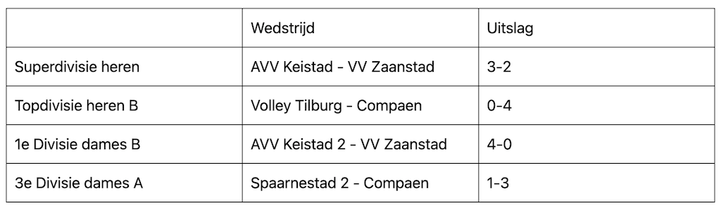 Compaen heren 1 was met setstanden 17-25, 24-26, 20-25, 22-25 te sterk in Tilburg en gaat dit seizoen voor de top in de Topdivisie. Daar staan ze op een knappe 2e plaats.