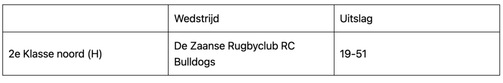 De nog puntloze Zaanse Rugbyclub ontving de Bulldogs uit Almere. Ook deze wedstrijd werd verloren. Er zijn nog drie competitiewedstrijden te gaan om punten in te halen.