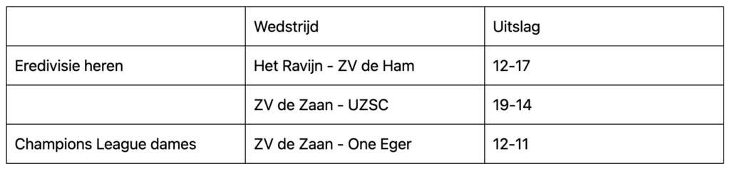 De heren van ZV de Ham blijven op dreef in de Eredivisie en ZV de Zaan staat nog steeds aan kop. Beide ploegen wonnen zaterdag hun wedstrijd.