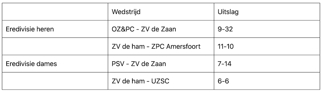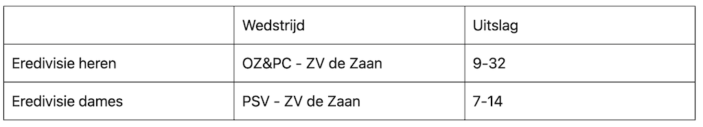 De ploegen van ZV de Zaan kwamen in actie in de Eredivisie. De heren schoten tweeëndertig keer binnen en de dames pakten de draad in de competitie, na de valse start in de Champions League van vorige week, op met een ruime overwinning in Eindhoven.