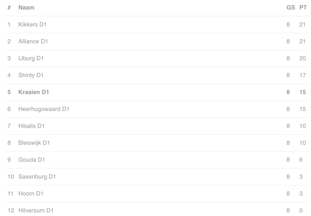 Nadat de Kraaien vorige week de topper van Alliance verloren gingen de dames deze zondag naar hoogvlieger IJburg. Daar werd wederom verloren waardoor we de Kraaien na acht speelronden op de 5e plek terugvinden met vijftien punten.