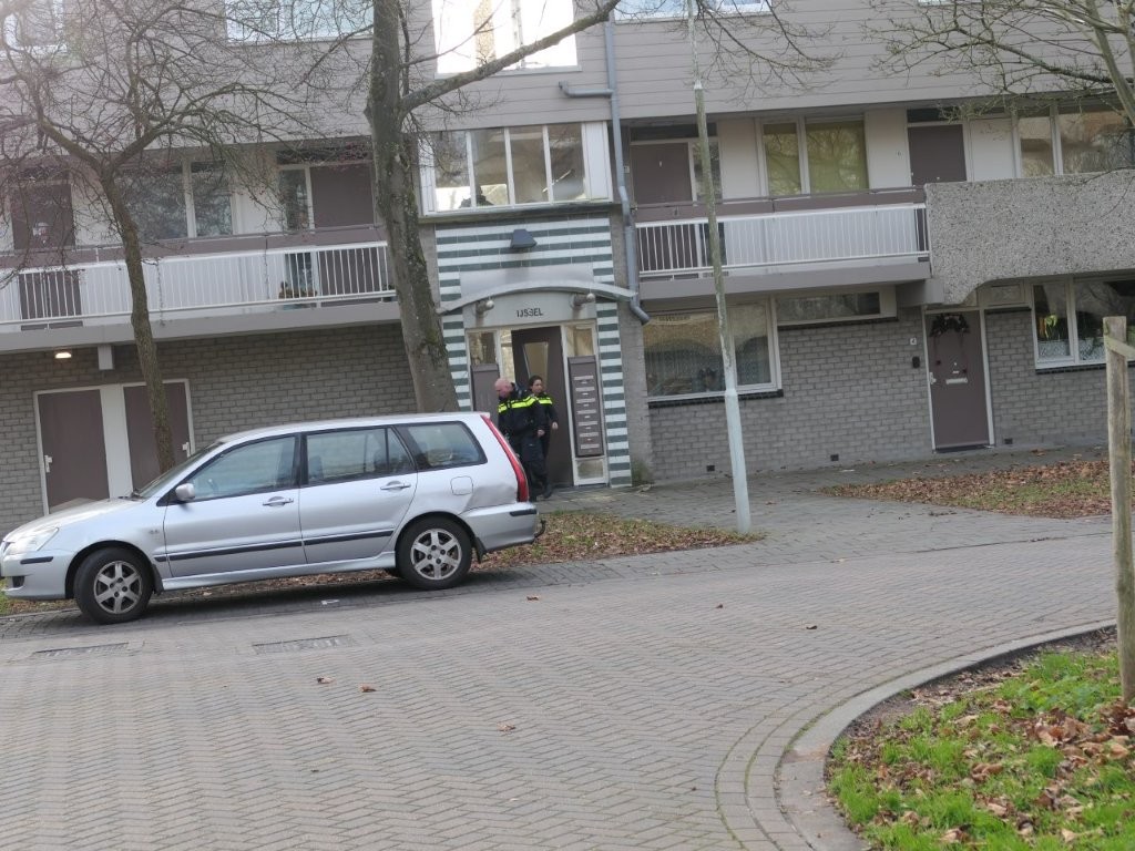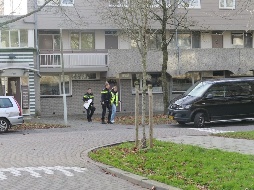 De politie zette een drone in om vanuit de lucht de situatie in beeld te brengen. Agenten stonden bij een appartementencomplex op de galerij op de eerste verdieping. Er is iets in een bewijszak meegenomen.