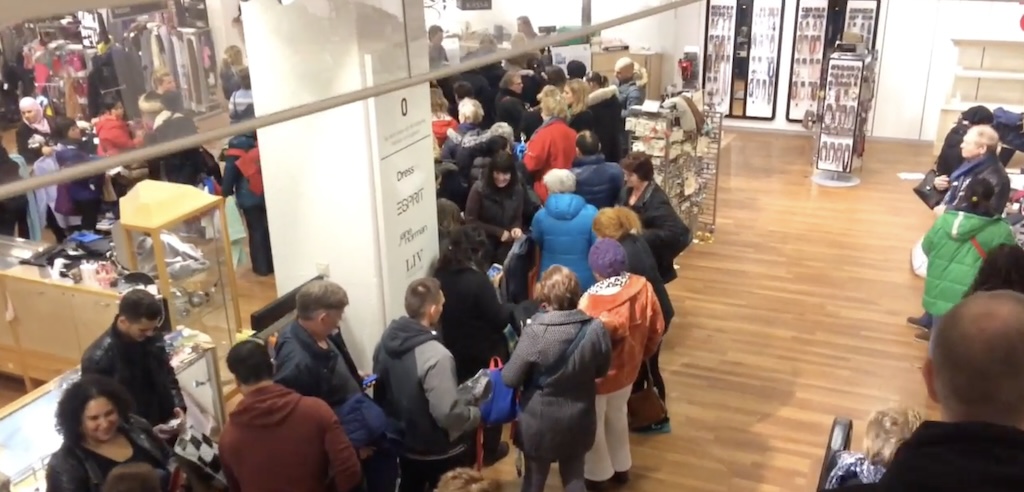 “Tientallen, honderden (?), er wordt zelfs gerept over een ‘enorme menigte’, ‘mensen massaal in de rij’ en ’topdrukte’. Alles wat nu nog in de winkel ligt, wordt verkocht en gaat naar schuldeisers. Op 21 april sluiten de deuren definitief. Net gingen de deuren open… Wij waagden het vanmiddag om voor jou (ja JOU) naar binnen te gaan en maakten een filmpje. #helden #trots.”