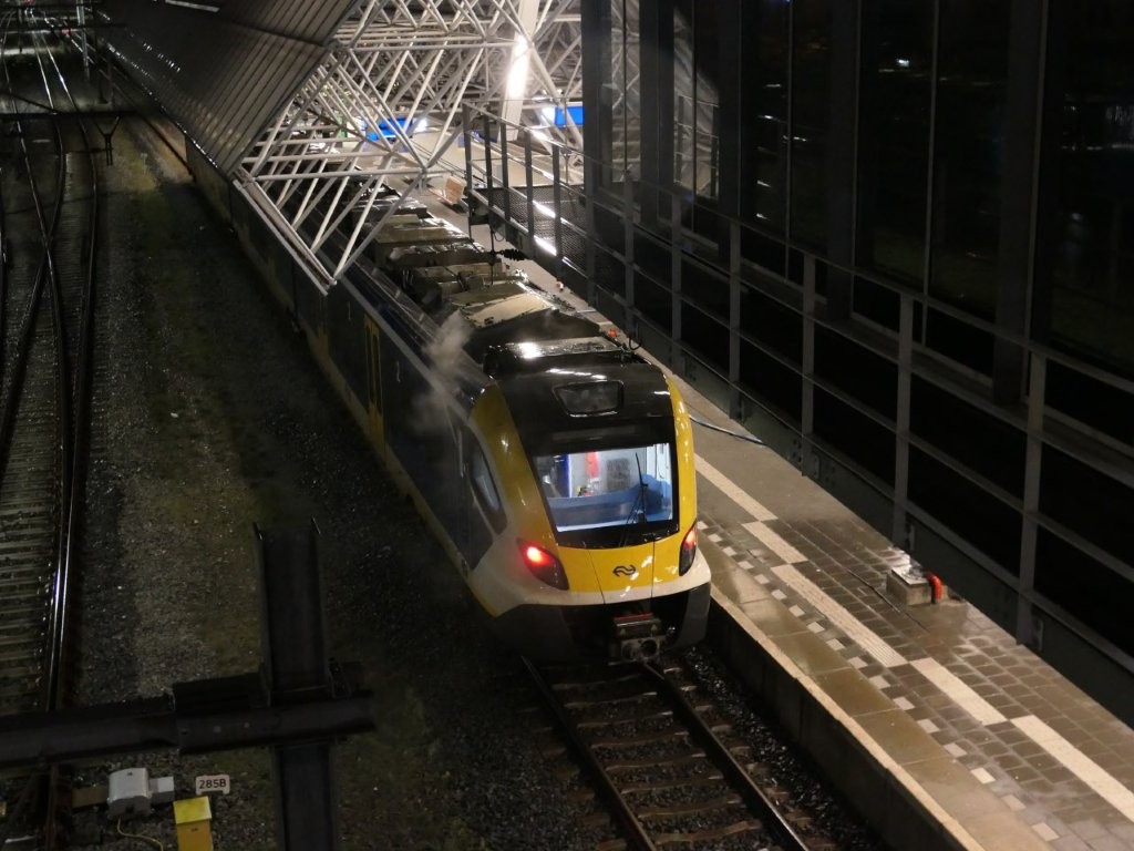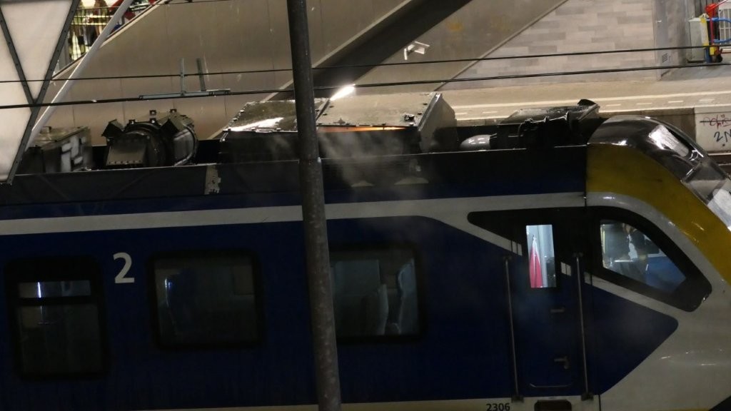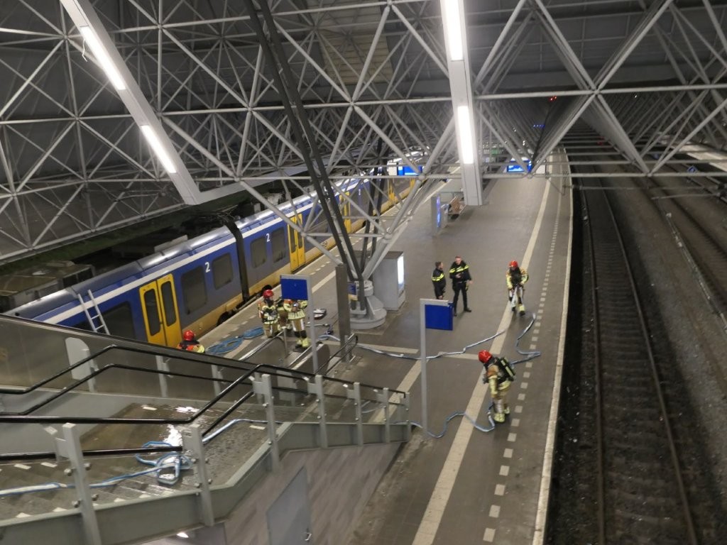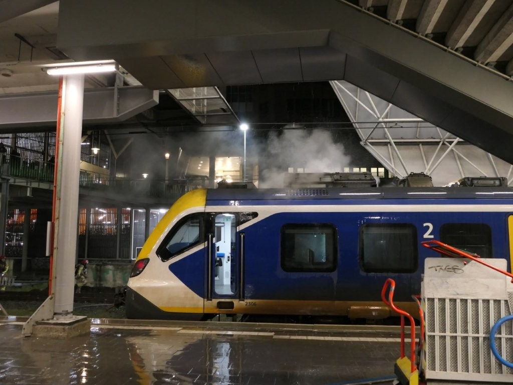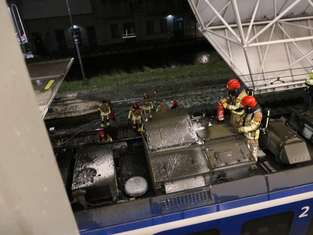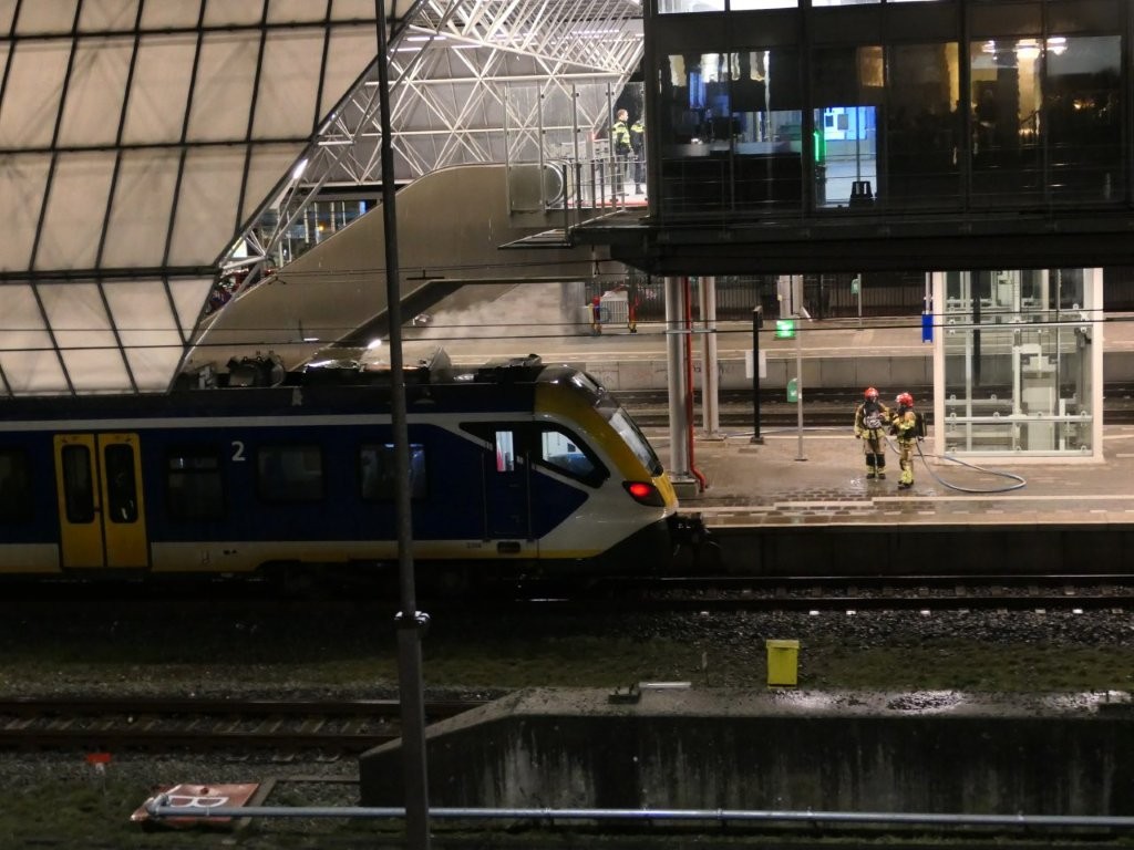 UPDATE: het treinverkeer is omstreeks 21.15 uur weer hervat. Treinen rijden soms met vertraging omdat alles van perron 1 en 2 moet vertrekken. ProRail Incidentenbestrijding voert werkzaamheden uit, maar die moesten tijdelijk gestaakt worden vanwege het onweer. De stroom is van de bovenleiding gehaald zodat de brandweer veilig kan werken. De trein kan niet meer zelfstandig verder rijden. De schade op het dak is aanzienlijk. Als de werkzaamheden zijn afgerond moet eerst stroom er weer op en pas daarna kan de trein worden weggesleept. De brand is ontstaan door een technisch mankement (niet door vuurwerk, dat was een gerucht dat eerder werd verspreid via het NHD). Het was waarschijnlijk een condensator in een elektrabak op het dak van het treinstel.