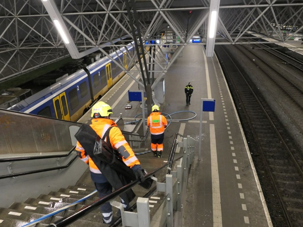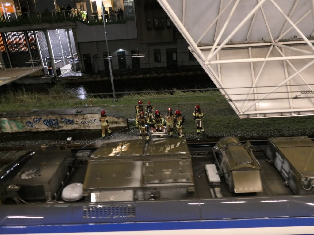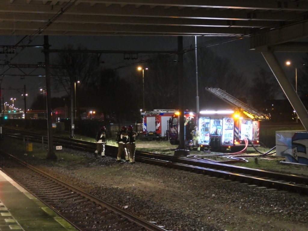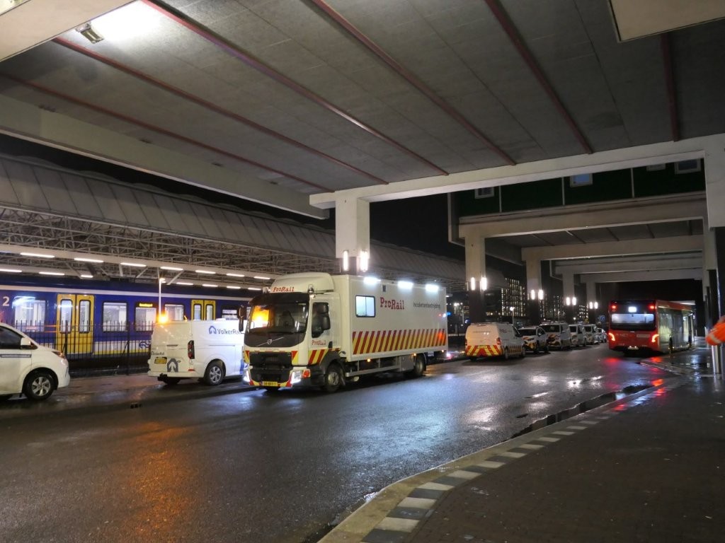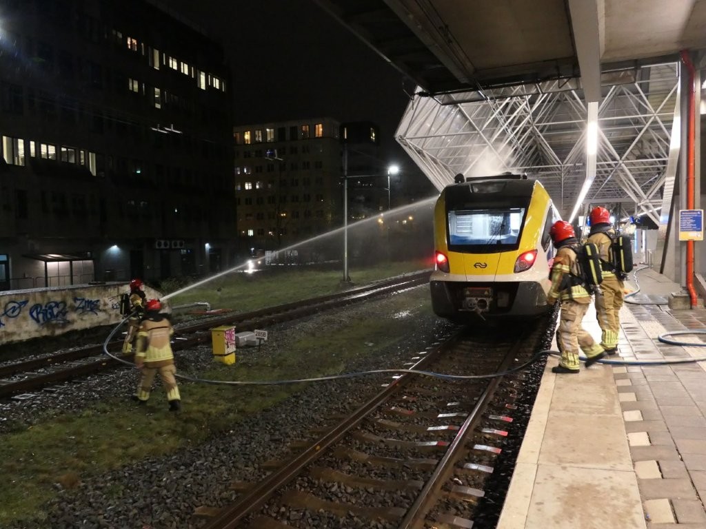UPDATE: het treinverkeer is omstreeks 21.15 uur weer hervat. Treinen rijden soms met vertraging omdat alles van perron 1 en 2 moet vertrekken. ProRail Incidentenbestrijding voert werkzaamheden uit, maar die moesten tijdelijk gestaakt worden vanwege het onweer. De stroom is van de bovenleiding gehaald zodat de brandweer veilig kan werken. De trein kan niet meer zelfstandig verder rijden. De schade op het dak is aanzienlijk. Als de werkzaamheden zijn afgerond moet eerst stroom er weer op en pas daarna kan de trein worden weggesleept. De brand is ontstaan door een technisch mankement (niet door vuurwerk, dat was een gerucht dat eerder werd verspreid via het NHD). Het was waarschijnlijk een condensator in een elektrabak op het dak van het treinstel.