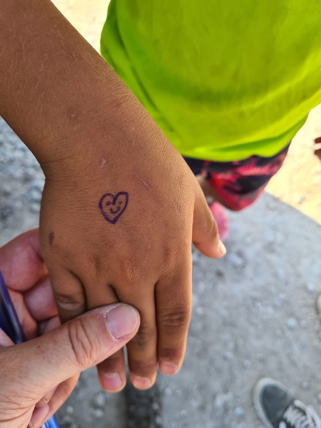 Na de lunch delen we de groententassen uit aan de zwangere vrouwen. Ik deel gratis โtattoosโ uit, teken smileys op handen. Morgen staat het uitdelen van de groentepakketten voor het hele kamp op de planning.