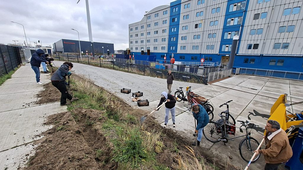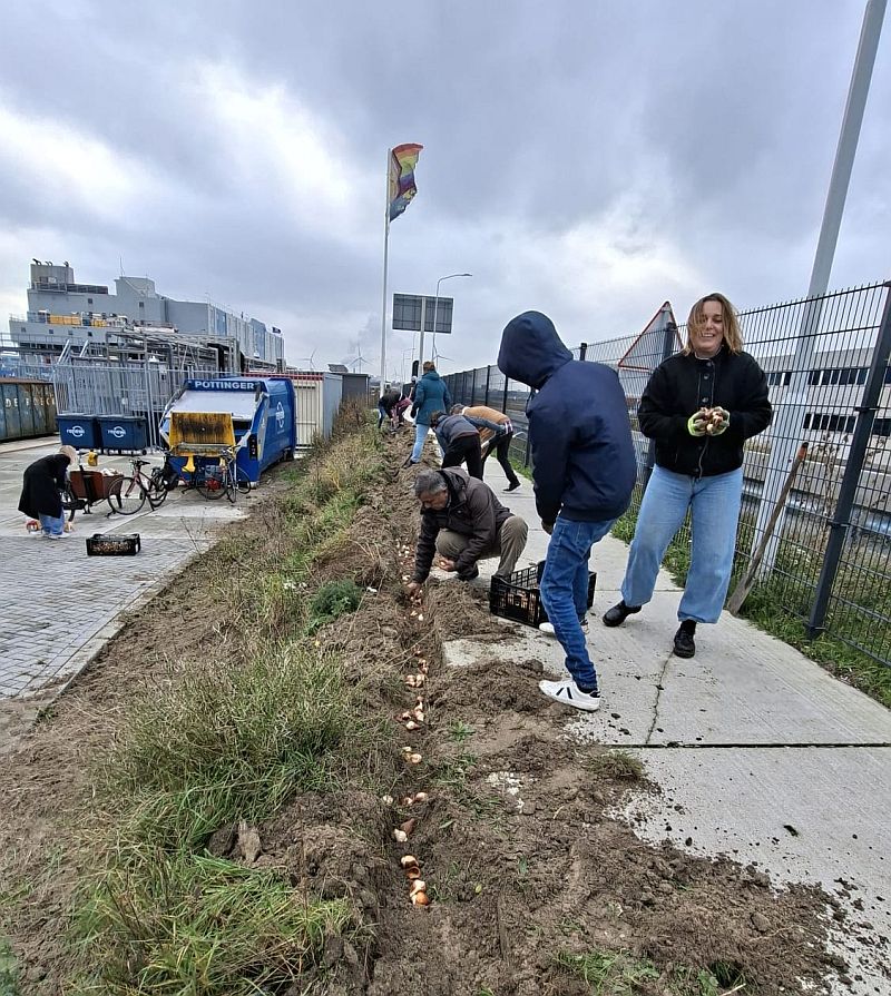 Marijn, Pauline, Thomas, Myra, Anja en Edwin van het Zaanse Warm Welkom Gerrit Bolkade-initiatief waren aan het planten toen ze spontaan hulp kregen van zes bewoners van de pontons. ‘Het was heel leuk om te zien hoe een aantal bewoners spontaan naar buiten kwam om te helpen met graven en planten’, vertelt Edwin Herzberg. Hij vond het leuk dat de vrijwilligers en de bewoners er samen voor zorgen dat de omgeving van de boten aan de Gerrit Bolkade er straks in de lente wat fleuriger uitziet:
