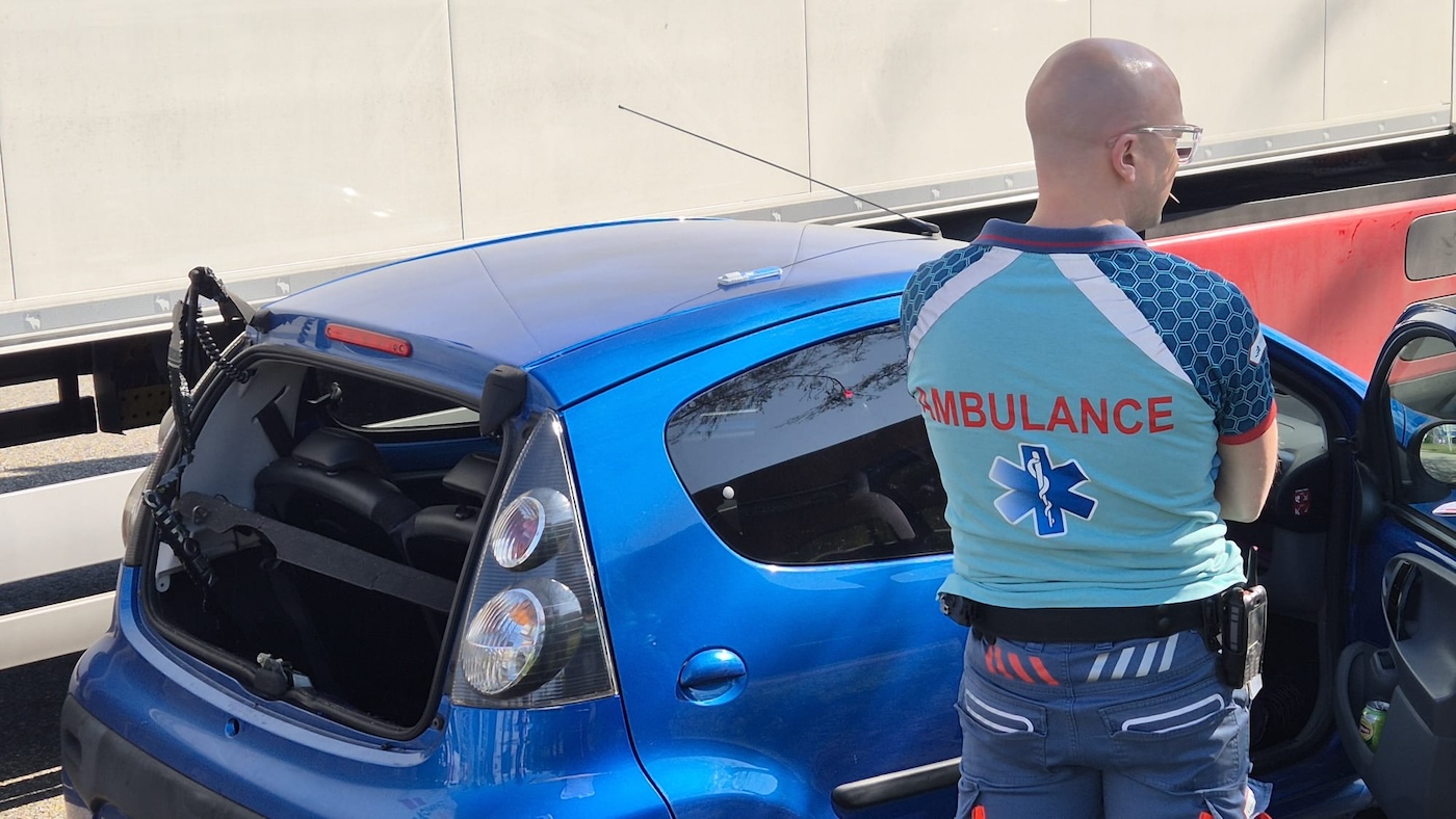 De schade aan de vrachtwagen bleef beperkt tot wat glas in de grille. De auto liep meer schade op en had onder meer een kapotte achterklep.