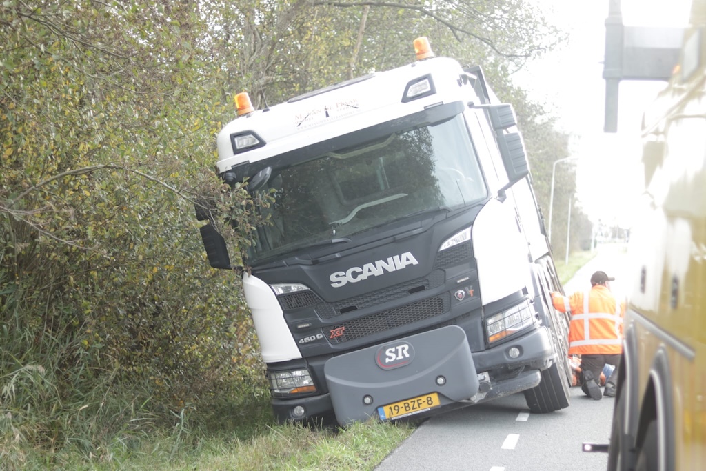 Een frontale botsing werd vermeden. Maar door de manoeuvre raakte hij zodanig in de berm dat de Scania 460G XT er niet meer op eigen kracht uit kon komen.