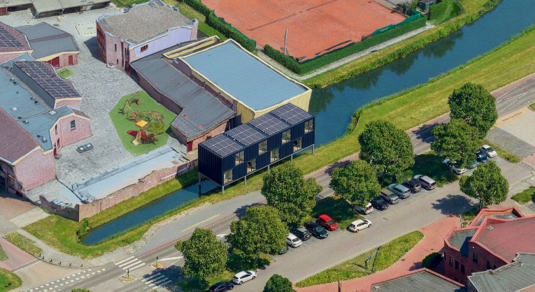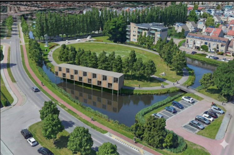 Eén van de mogelijke locaties is aan de rand van de Groene Wig, half op het land, half boven het water. De andere optie is tussen het schoolplein en de Rigastraat in. Ook bij deze optie staat een deel van de pilaren van de noodlokalen pootje te baden.