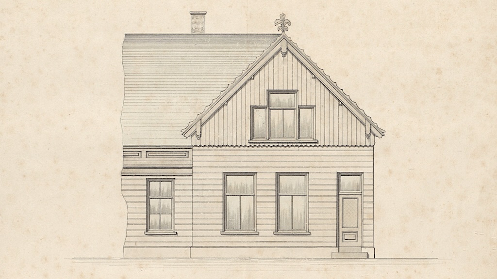 Maar is het nu 1920 of 1881? Op de bouwtekening uit 1881 (Gemeentearchief) zijn verschillen (plaats van ramen en deuren) maar ook overeenkomsten te zien (plankenstructuur en versieringen aan de dakrand). Wij hebben geen tekeningen van een bouw in 1920 kunnen vinden.