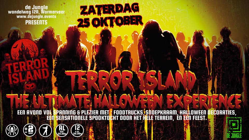 The Ultimate Halloween Experience: De Jungle in Wormerveer wordt in samenwerking met de organisatoren van Halloween aan de Watering omgetoverd tot een angstaanjagend eiland: ‘Terror Island!’ Op zaterdag 25 oktober wordt loop je tijdens een griezelige spooktocht door de spannende stukken en paden van het Jungle terrein. Bij een gezellig kampvuurtje kun je even bijkomen en bij de verschillende foodtrucks kun je passende snacks kopen. Er is muziek tot in de late uurtjes. Ga verkleed, neem je vrienden mee en bereid je voor op een avond vol kippenvel. Van 18.00 – 01.00 uur. Toegang € 10,00 en voor kinderen onder 10 jaar gratis.