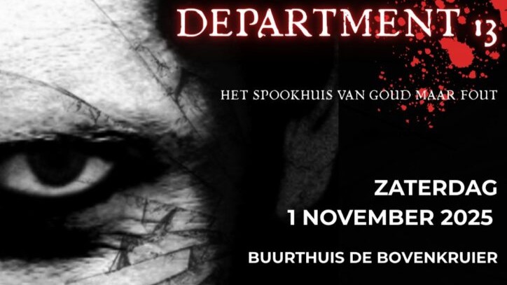 Halloween spookhuis ‘Department 13’: Durf jij het aan? Stap op zaterdag 1 november bij buurtcentrum De Bovenkruier binnen in Department 13 – het spookhuis waar niets is wat het lijkt en ontsnappen geen garantie is. Een avond vol spanning, angst en duistere verrassingen wacht op jou. Trek je moedige vrienden mee, want alleen red je het nooit… Let op: de adviesleeftijd voor het Halloween spookhuis is 10+. Van 19.00 – 22.00 uur, toegang € 2,00.