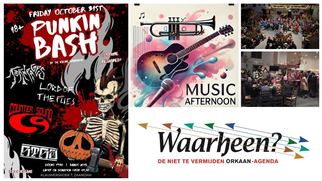 De komende dagen: Volendamse Avond in de Koppie Bar Assendelft, Remco Vrijdag in het Zaantheater, Honderdste Bazar in en bij de Grote Kerk Westzaan, DJ Fortuin’s omgevallen platenkast bij BIND op het Hembrugterrein, Muziekmiddag in de Bovenkruier Zaandam, Droomwerelden in Het Weefhuis Zaandijk, Jubileumconcert Harmonie NUEVO in de Noorderkerk Zaandam, Huub Cooijmans in Theater De Kaasfabriek Wormer, Hot Revival Stompers in de Vermaning Wormerveer. Halloweenparty’s en activiteiten rond Lichtjesavond en nog veel meer. Kijk maar in onze uitgaansagenda.