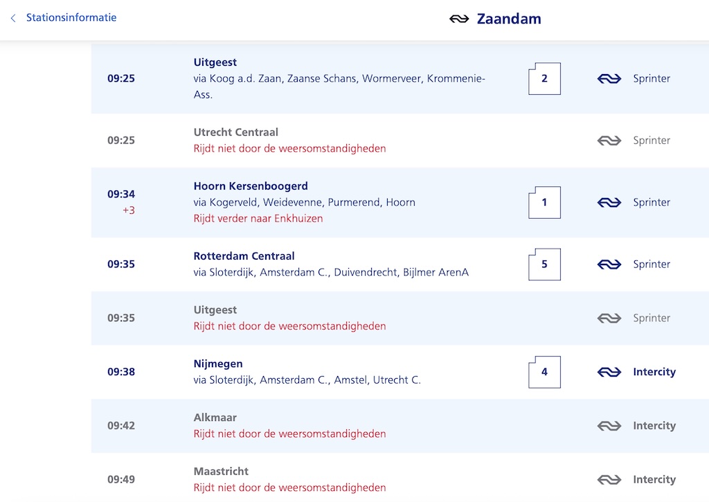 De NS rijdt een winterdienstregeling: minder treinen, extra reistijd, vaker overstappen en drukte in de trein. Plan je reis kort voor vertrek met de reisplanner voor een zo actueel mogelijk reisadvies. Deze ochtend vertrekken er mondjesmaat treinen vanaf Zaandam. De meeste treinen zijn uitgevallen.