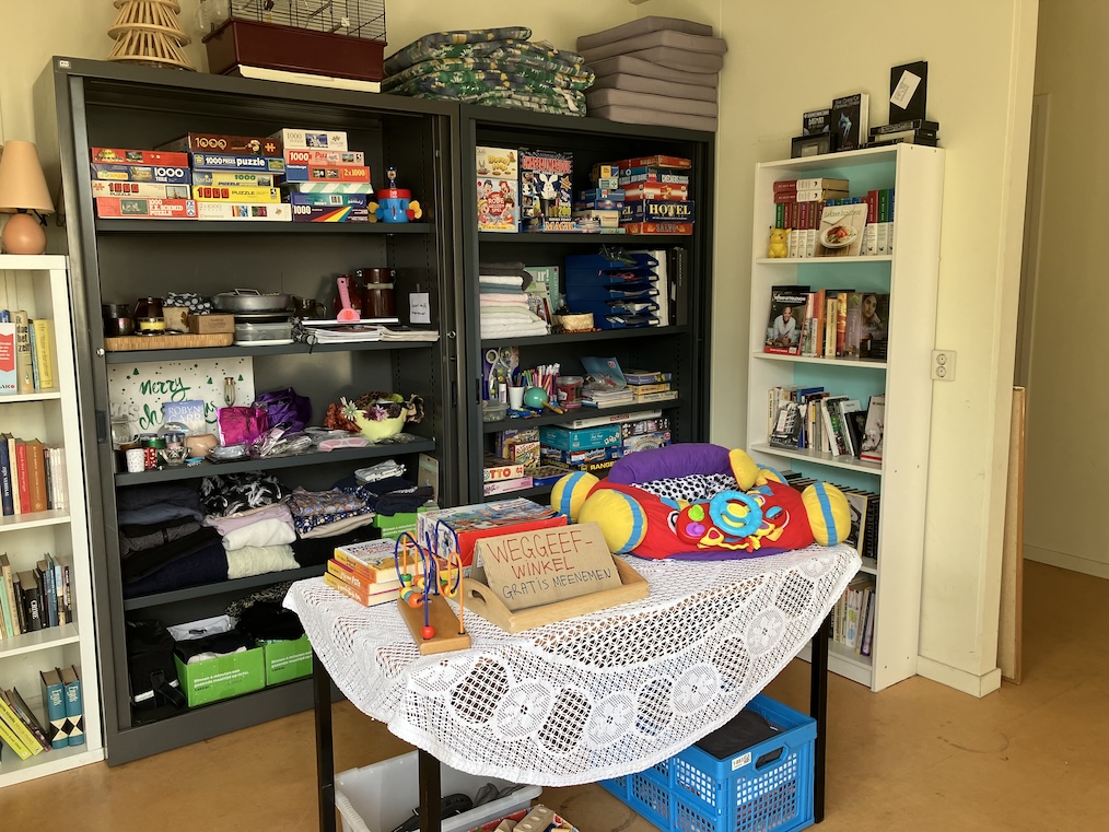 De winkel draait op mensen die spullen brengen die te goed zijn om weg te gooien. Anderen mogen meenemen wat ze nodig hebben. Gratis. Huisraad, boeken, speelgoed, puzzels, speakers… elke week komt er van alles binnen. Het mag gebruikt worden of worden weggegeven als cadeau.