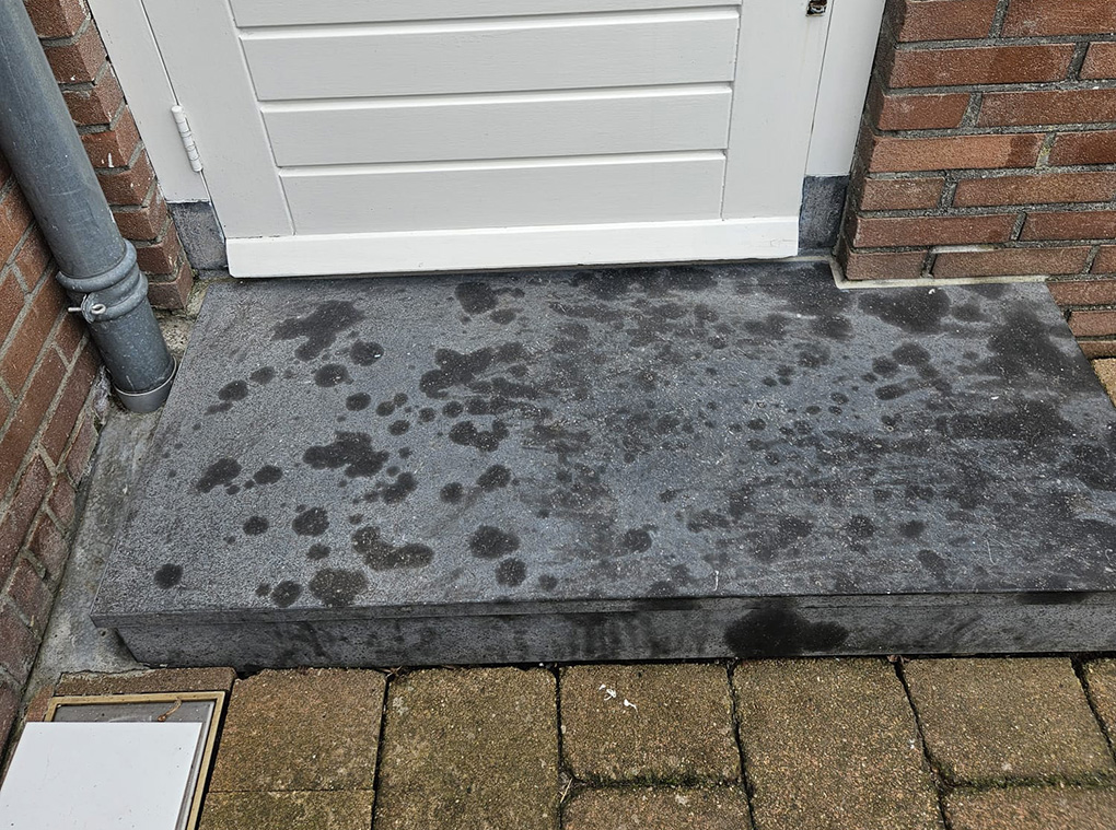 En als het niet lukt de olie en de sporen te verwijderen kan het een dure grap worden als terrassen etc. vernieuwd moeten worden.