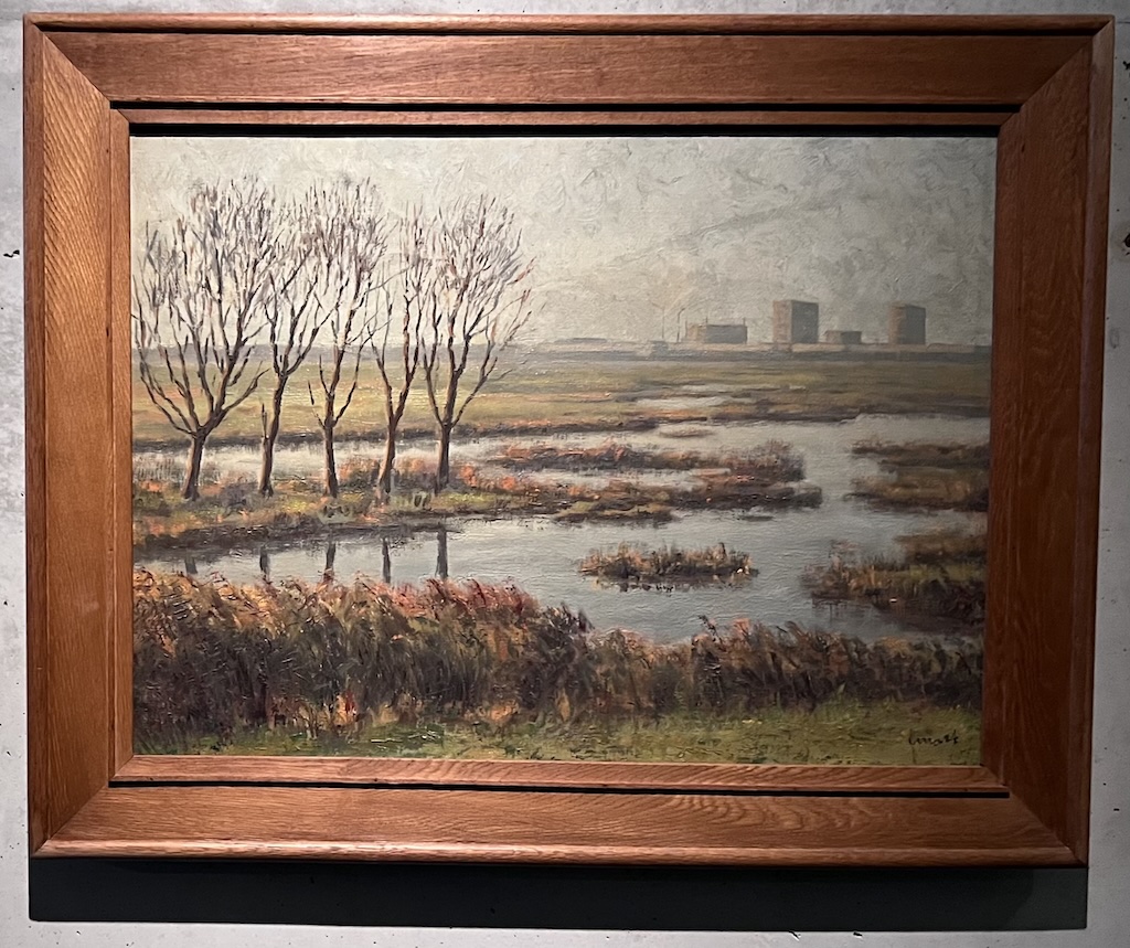 Boven De Dam en een NAP-hoogte-aanduiding. Onder een schilderij van Frans Mars uit het eind van de jaren vijftig. Vanaf de Zuiddijk zicht op de Breijnderbraak, met op de achtergrond de in aanbouw zijnde flats in de Vijfhoek. Die naam komt van een weiland dat daar lag.