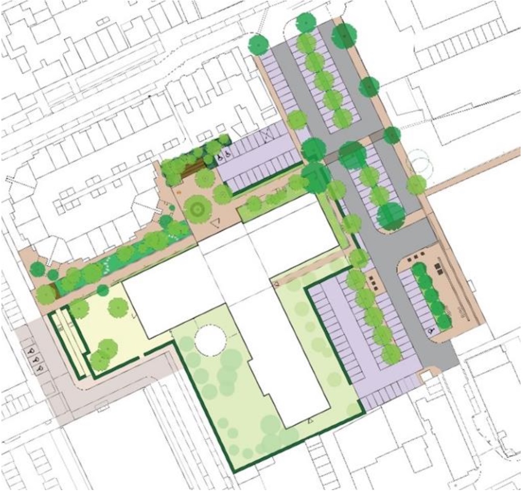 De witte ‘T’ is de locatie van de nieuwbouw, de paarse vlakken zijn parkeerplekken