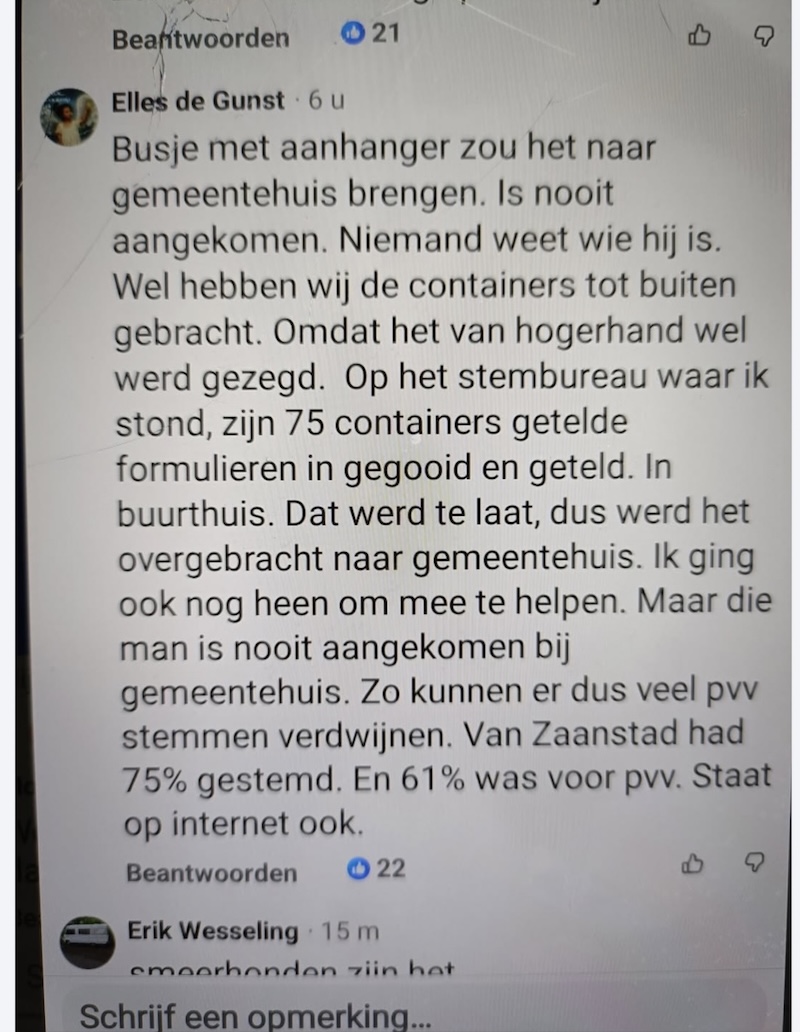 Tja, ‘geen idee of het allemaal waar is’ maar het wel de wereld insturen. Het bericht kreeg 3.200 likes, werd 772.000 keer gelezen, 1.100 keer geretweet en kreeg ook nog eens 1.500 reacties. Die waren overigens meestal weinig instemmend: ‘Trumpiaanse bullshit’, ‘zielige verliezer’, ’75 containers in een buurthuis?’ alhoewel Wilders ook steun kreeg: ‘ruikt naar ongeregeldheden binnen de telling’. Meer mensen roken onraad: