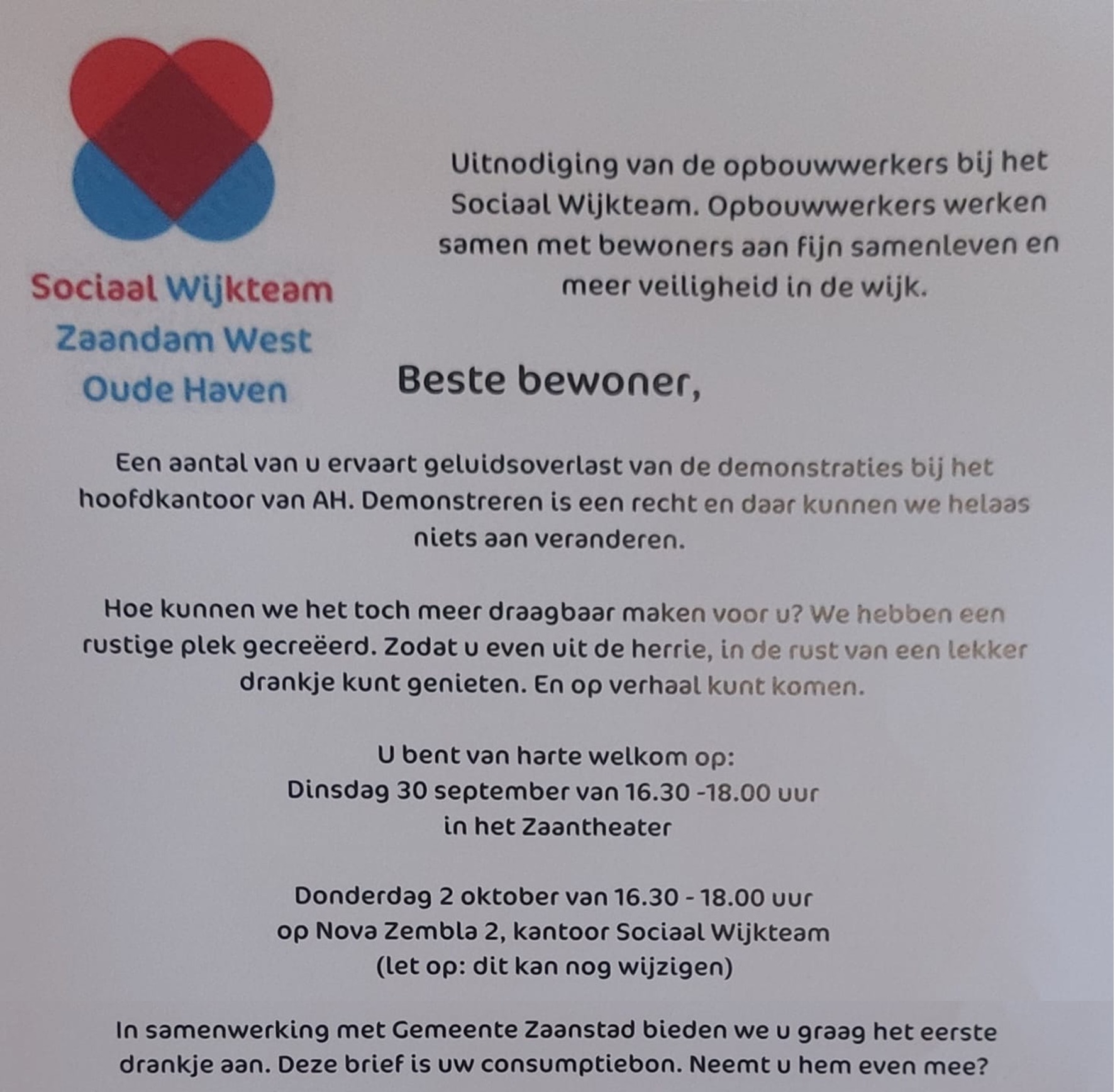 Bewoners van Zaandam die in september overlast ondervonden van de lawaai-demonstraties bij het hoofdkantoor van Ahold Delhaize aan de Provincialeweg in Zaandam mochten deze week tot rust komen in het Zaantheater. Daar kregen ze van het Wijkteam en Zaanstad een drankje aangeboden. Een herkansing was er vanmiddag op het kantoor van het Sociaal Wijkteam aan het Nova Zembla.